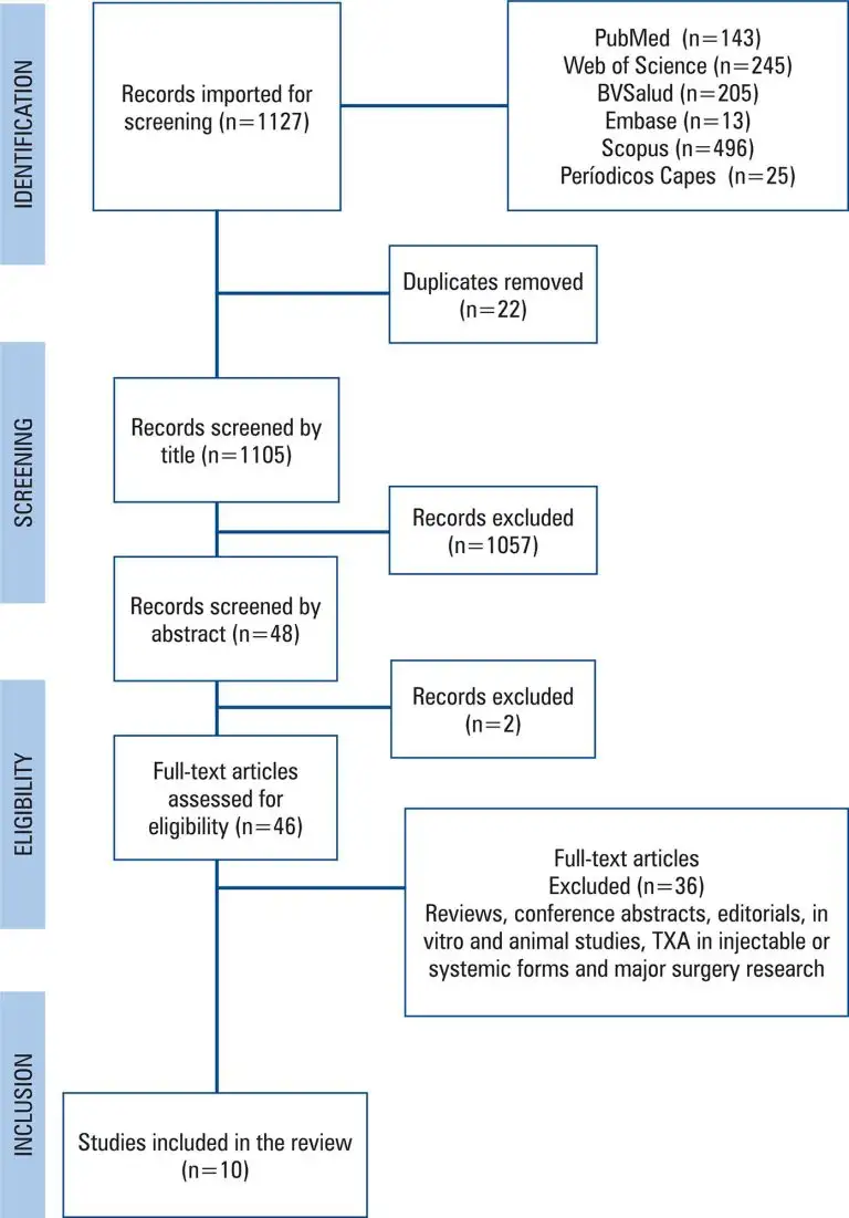 ABSTRACT Objective: This scoping review evaluated the efficacy of topical tranexamic acid powder, prepared from crushed tablets, for bleeding prevention during minor oral surgical procedures. Methods: A comprehensive literature search was conducted in accordance with PRISMA-ScR guidelines across MEDLINE/PubMed, Elsevier, Embase, BVSalud, Web of Science, and Periódicos CAPES. Studies investigating topical tranexamic acid in powder form for minor dental procedures were included. Reviews, in vitro or animal studies, and investigations focusing on systemic, injectable, or mouthwash formulations of tranexamic acid […]