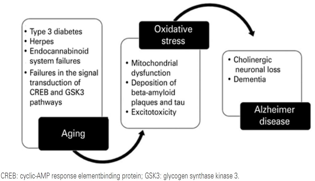 Alzheimer’s disease is a neurodegenerative condition that causes changes in memory and cognition, in addition to behavioral disorders, and most commonly affects the elderly. Several studies in the literature have presented therapeutic measures in an attempt to interfere with the pathogenic mechanisms of the disease and to mitigate its clinical manifestations. Some factors, such as excitotoxicity, cholinergic dysfunctions, oxidative stress, tau protein hyperphosphorylation, changes in amyloid-beta peptide metabolism, herpes viruses, apolipoprotein E, glycogen synthase kinase 3, insulin resistance, and the endocannabinoid system seem to be related to pathophysiology of Alzheimer’s disease. Given this, a literature review was carried out to address the molecular mechanisms associated with the pathophysiological hypotheses previously mentioned, aiming to better understanding their underlying causes and contributing to possible pharmacological strategies about treatment of the disease.