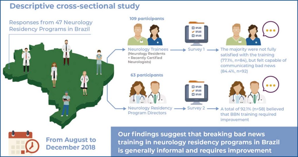 We aimed to evaluate how breaking bad news training was implemented in neurology residency programs in Brazil and to assess the perception and preparedness of trainees and program directors.