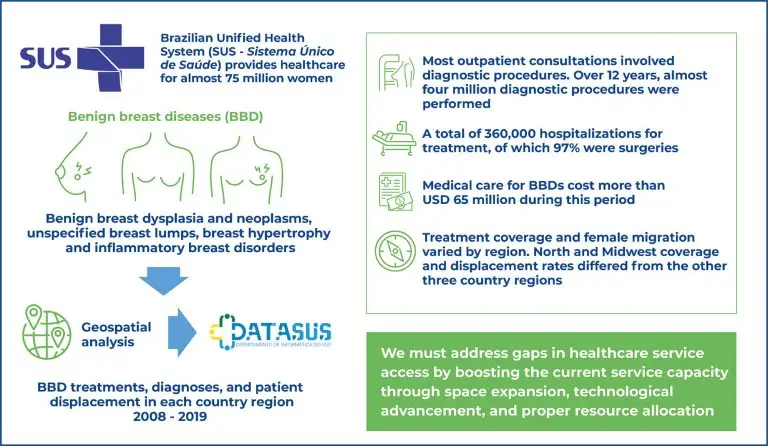 Highlights ■ Most outpatient consultations comprised diagnostic procedures. ■ In the past 12 years, medical care for benign breast diseases has cost >USD 65 million. ■ Women from North and Midwest Brazil had higher diagnosis and treatment displacement rates. ABSTRACT Objective: To quantitatively and geospatially analyze coverage and displacement for the diagnosis and treatment of benign breast diseases in the Brazilian Unified Health System between 2008 and 2019. Methods: Datasets from the Brazilian Ministry of Health were used to survey […]