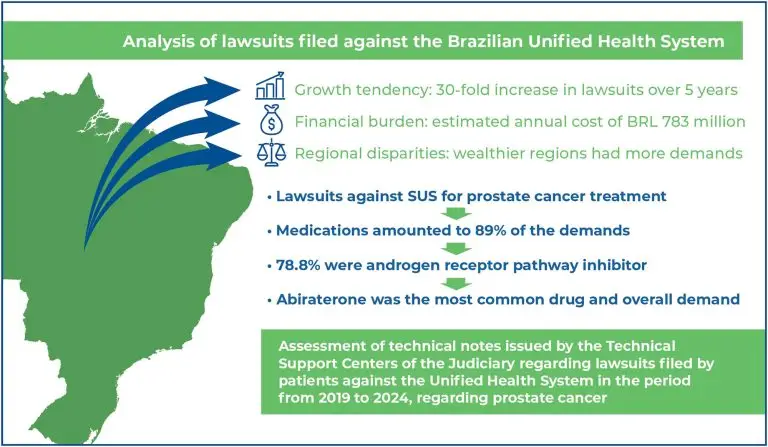 Highlights ■ A total of 89% of the 3,136 legal demands sought medication. ■ Androgen inhibitors amounted to 78.8% of all lawsuits, particularly abiraterone. ■ There is a growth tendency in judicialization, with a 30-fold increase over 4 years. ■ The estimated annual financial burden of judicialization on the Brazilian United Public Health System has reached BRL 783 million. ABSTRACT Objective: Considering the difficulties of Brazil’s Public Health System in providing comprehensive care, the present article aimed to assess legal […]