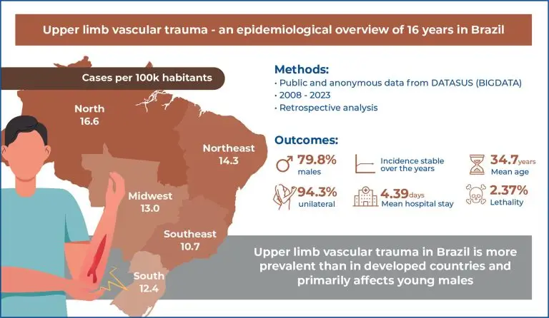 Highlights ■ Brazil had a higher upper limb vascular trauma incidence than the US, remaining stable over the years. ■ The region with the highest proportion of cases was the North, followed by the Southeast. ■ The most affected population was young men, with a lethality of 2.37%, comparable to that globally. ■ Most patients did not require intensive care (92.8%), and the average hospital stay was 4.39 days. ABSTRACT Objective: To evaluate the epidemiology of upper limb vascular trauma […]