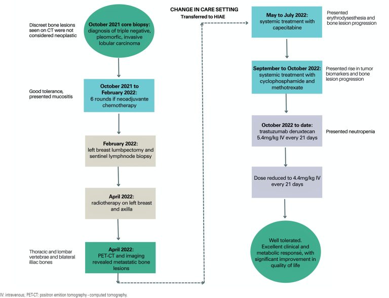 Abstract Breast cancer is one of the most prevalent and heterogeneous cancers worldwide; however, it remains a complex and enigmatic disease. Advances in targeted therapies combined with increasing knowledge about tumor subtypes and molecular profiling have placed precision medicine on the frontier of oncological treatments. The recent classification of certain HER2 tumors as HER2-low, along with emerging evidence from studies using antibody-drug conjugates to target specific tumor profiles, highlights the relevance of this case study. This report describes the treatment […]