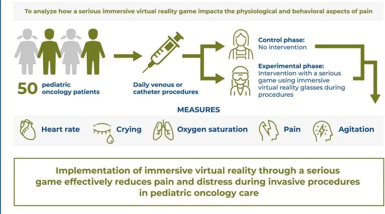 Highlights ■ Immersive virtual reality reduced heart rate, pain, agitation, and crying during pediatric venipuncture. ■ This technology effectively reduced pain during repeated invasive procedures, including catheter punctures. ■ The serious game strategy is low-cost, easy to implement, and well-suited for pediatric oncology care. ABSTRACT Objective: To analyze the impact of a serious immersive virtual reality game on the physiological and behavioral aspects of pain during peripheral venous access or central catheter puncture in children and adolescents with cancer. Methods: […]