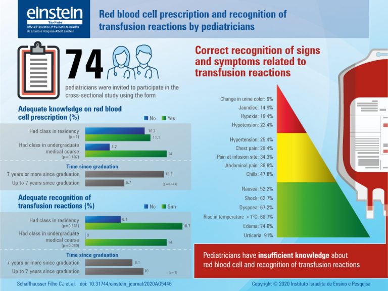 ABSTRACT Objective To assess the level of knowledge of emergency pediatricians on red blood cell transfusions and their reactions. Methods Written survey with emergency pediatricians from a pediatric hospital. Results Less than 20% of pediatricians showed appropriate knowledge on prescribing red blood cells and recognition of transfusion reactions. There was no significant statistical regarding time since graduation and blood transfusion classes in undergraduate studies or during medical residency. Conclusion Pediatricians have insufficient knowledge about red blood cell transfusions and recognition […]