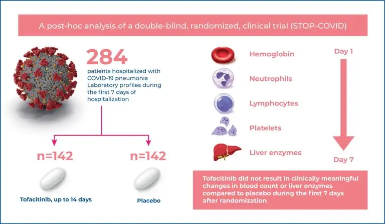Highlights Tofacitinib use did not result in meaningful changes in hematological parameters. Tofacitinib use did not lead to clinically meaningful changes in liver enzymes. ABSTRACT Objective: Tofacitinib, an oral Janus kinase inhibitor, has been tested against a placebo in 289 patients with COVID-19 pneumonia. We analyzed the data from the tofacitinib- and placebotreated patient cohorts to evaluate the laboratory profiles between baseline and day 7. Methods: We performed post hoc analyses on the following laboratory tests over time during the […]