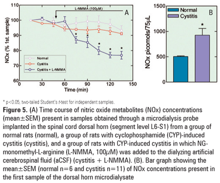 OBJECTIVE: To determine the concentration of nitrate/nitrite in the cerebrospinal fluid and in the dorsal horn interstice of the L6-S1 spinal cord boundary in rats with or without cystitis induced by cyclophosphamide. METHODS: All experiments were conducted using Wistar female rats. A microdialysis probe was implanted in the subarachnoid space or in the spinal cord tissue at the L6-S1 segments (confirmed histologically). Two days later, the microdialysis probe was perfused with artificial cerebrospinal fluid, containing or not NG-monomethyl-L-arginine. Samples were […]