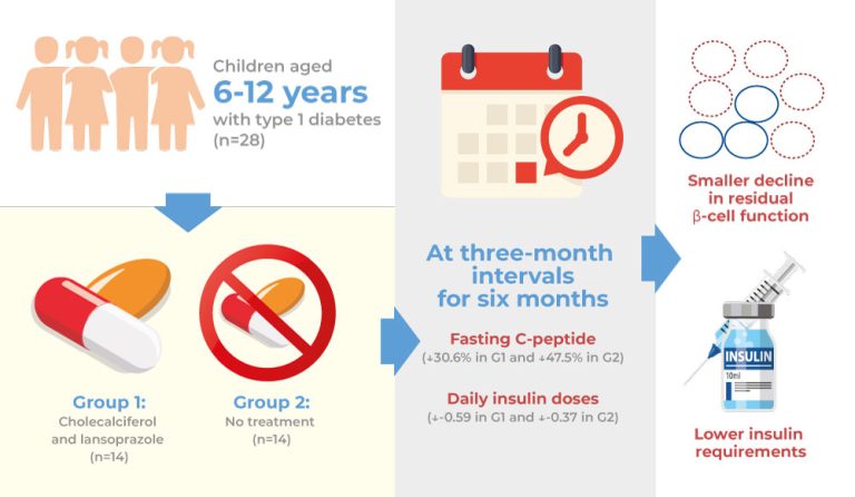 Keywords: Blood glucose; C-peptide; Cholecalciferol; Diabetes mellitus; Drug tapering; Fasting; Glycated hemoglobin A; Glycemic control; Lansoprazole; type 1