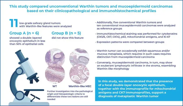 Highlights ■ Immunohistochemistry distinguishes Warthin-like mucoepidermoid carcinoma from metaplastic Warthin tumor. ■ CK7, mitochondrial patterns, and double-layer epithelium suggest metaplastic Warthin tumor. ■ Basal CK14, CK5/6, and p63 distinguish metaplastic Warthin tumor from Warthin-like mucoepidermoid carcinoma. ABSTRACT Objective: This study aimed to analyze the clinicopathological and immunohistochemical profiles of unconventional Warthin tumors and mucoepidermoid carcinomas. Methods: Eleven low-grade salivary gland tumors with Warthin-like features were analyzed. Group A (n=6) showed a double-layered oncocytic epithelium in less than 50% of the […]