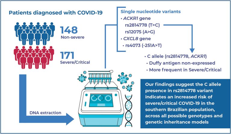 Highlights ■ The rs2814778 C allele is linked to severe/critical COVID-19. ■ The association is independent of major clinical risk factors. ■ The Duffy “null” phenotype may promote lung inflammation. ■ rs12075 and rs4073 showed no association with COVID-19 severity. ABSTRACT Objective: This study aimed to analyze the possible association between rs2814778, rs12075 (ACKR1 gene), and rs4073 (CXCL8 gene) single nucleotide variants and COVID-19 severity. Methods: This cross-sectional study included 319 COVID-19 diagnosed patients at two hospitals in Paraná, Brazil […]
