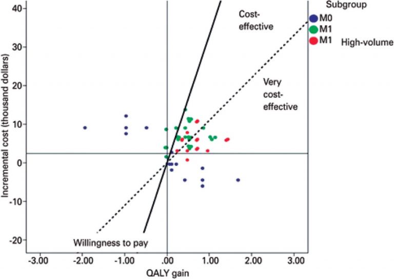 ABSTRACT Objective To evaluate the cost-effectiveness of the addition of chemotherapy or abiraterone to androgen deprivation. Methods We developed an analytical model to determine the cost-effectiveness of the addition of docetaxel or abiraterone versus androgen deprivation therapy alone. Direct and indirect costs were included in the model. The effects were expressed in Quality-Adjusted Life Years adjusted for side effects. Results Compared to androgen deprivation therapy alone, the addition of chemotherapy and of abiraterone generated 0.492 and 0.999, respectively, in Quality-Adjusted […]