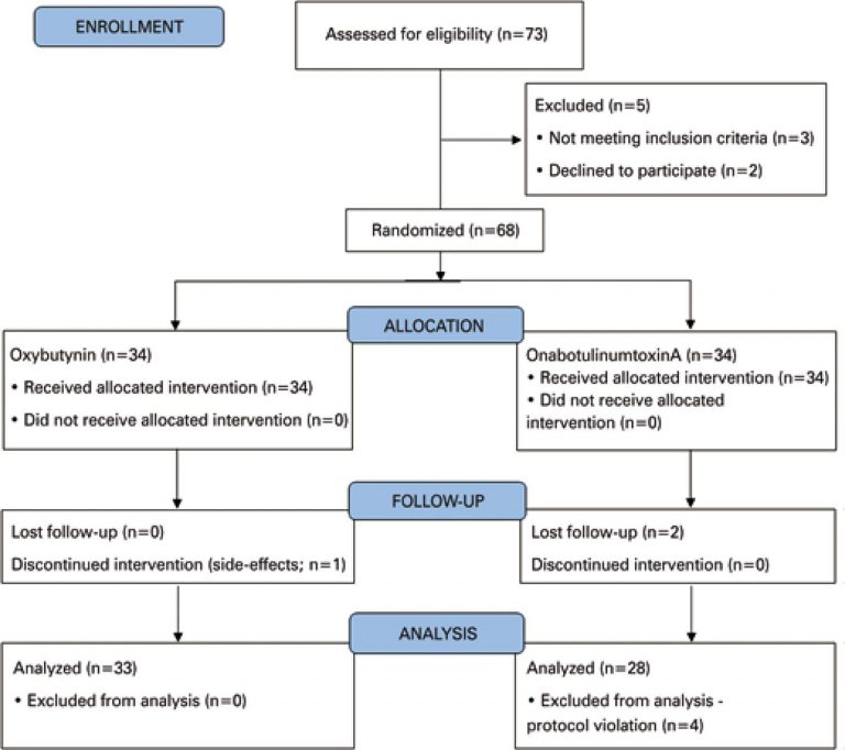 ABSTRACT Objective To prospectively compare the results of intradetrusor onabotulinumtoxinA injections and oral oxybutynin for urinary continence, urodynamic parameters and quality of life in patients with neurogenic detrusor overactivity due to spinal cord injury. Methods Adult patients under intermittent catheterization were randomized 1:1 to receive one injection of onabotulinumtoxinA 300U or oxybutynin 5mg, per oris, three times/day. Primary study endpoint was change in urinary incontinence episodes/24 hours and secondary study endpoints were maximum cystometric capacity, maximum detrusor pressure, bladder compliance […]
