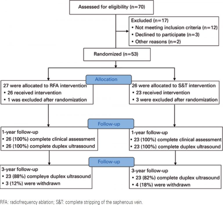 ABSTRACT Objective: To compare the use of the radiofrequency thermoablation of the saphenous vein with the ligation technique, and complete removal of the saphenous vein, from the saphenofemoral junction to the ankle. Methods: A total of 49 patients with chronic venous disease in the Comprehensive Classification System for Chronic Venous Disorders (CEAP) classes 2 to 4 for clinical signs, etiology, anatomic distribution and pathophysiology, were assessed at baseline, after 4 weeks, and after 1 year. The parameters assessed were complications, […]