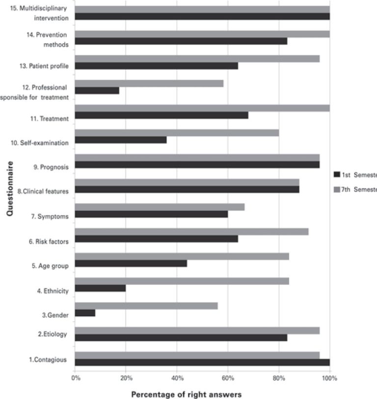 ABSTRACT Objective: To evaluate and compare the knowledge of dental undergraduate students about oral cancer. Methods: The students were divided into two groups according to semester attended in the undergraduate course: Group A, the first semester; and Group B, seventh semester. They were asked to answer a questionnaire about epidemiology, risk factors, clinical aspects, therapeutic solutions and oral self-examination. For statistical analysis, the Fisher’s exact test, the Cochran’s G test and Kendall’s concordance test were used, with significance level set […]