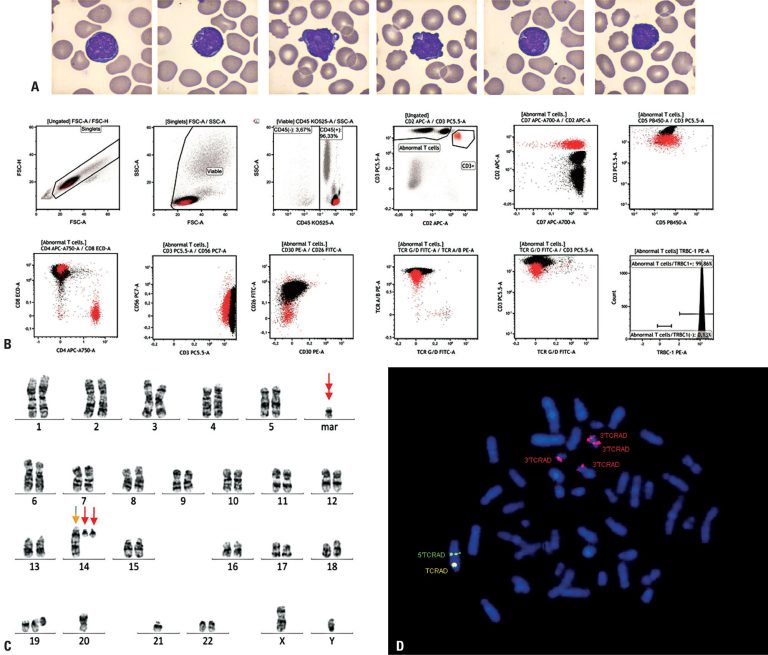 ABSTRACT T-cell prolymphocytic leukemia is a rare and aggressive mature T-cell malignancy that usually presents with marked lymphocytosis, hepatosplenomegaly, lymphadenopathy, and B symptoms. However, a minority of patients present with an indolent, asymptomatic form. Case Report: A 44-year-old man was diagnosed with asymptomatic T-cell prolymphocytic leukemia after routine blood tests revealed persistent lymphocytosis. Immunophenotyping revealed a mature CD4–/CD8+ T-cell population. Cytogenetic analysis showed 14q11.2 abnormalities with TCRAD rearrangement by fluorescent in situ hybridization. A monoclonal T-cell population was confirmed by […]