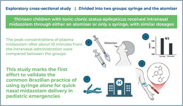 Highlights ■ Intranasal midazolam with an atomizer is a treatment for pediatric status epilepticus. ■ In Brazil, the atomizer is often replaced with a syringe owing to the cost of the device. ■ We compared midazolam plasma levels with and without an atomizer in children with epilepsy. ■ No significant difference was found, supporting the syringe-only use in emergencies. ABSTRACT Objective: Convulsive status epilepticus is the most common neurological emergency in children with high morbidity and mortality rates. Intranasal midazolam […]