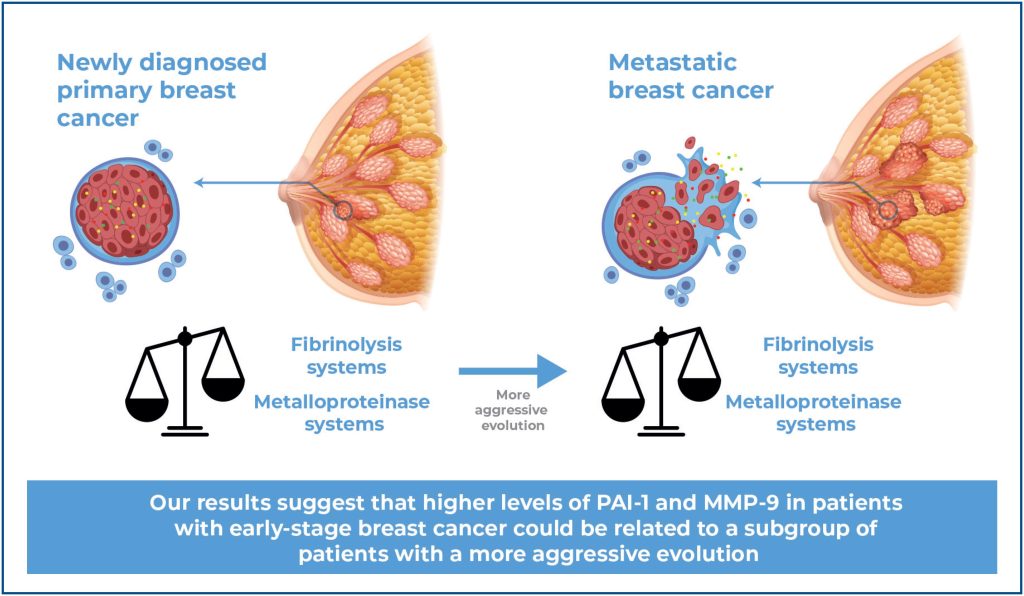 The hemostatic and matrix metalloproteinase (MMP) systems are known to be altered in patients with breast cancer. This cross-sectional study aimed to explore the fibrinolysis components values and MMP-9 levels in a specific population of patients with early breast cancer and metastatic breast cancer in Tucumán, Argentina.