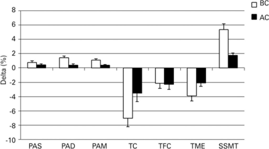 After exercise training, there was a significant reduction (p<0.001) in body weight, systolic, diastolic and mean blood pressure, an increase in lower and upper limb strength (chair-stand test and elbow flexor test) as well as in aerobic capacity (stationary gait test) and functional capacity (sit down, stand up, and move around the house) in both groups. However, in the Low Milk Intake Group significant changes were observed: body weight (+0.5%), systolic, diastolic and mean blood pressure (+0.9%,+1.4% and +1.1%, respectively), lower extremity strength (-7.0%), aerobic capacity (-3.9%) and functional capacity (+5.4) after detraining. These parameters showed no significant differences between post-detraining and post-training period in High Milk Intake Group.