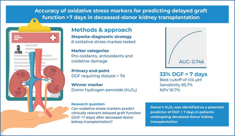 A translational pilot study was carried out and a five-step hierarchical diagnostic accuracy strategy was applied to evaluate the predictive value of oxidative stress markers for DGF >7 days in adult patients with end-stage kidney disease undergoing deceased-donor KTx. Statistics comprise multiple conventional methods, C-statistics, and diagnostic test performance measures.