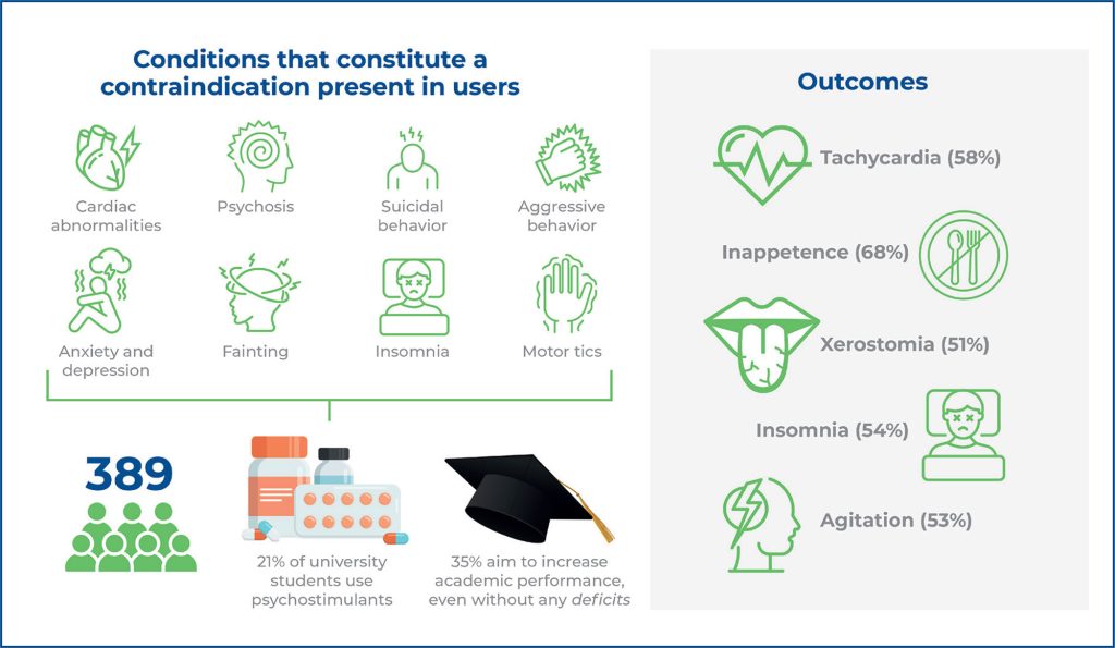 The prevalence of psychostimulant use was 21%, primarily in men (23.07%), medicine students (19.70%), and psychology students (18.91%). Methylphenidate was the most commonly used drug (57%). Concomitant use of psychostimulants was reported in 37% and 35% of participants who started using them during graduation. A justifiable medical diagnosis was reported by 65% of the participants; however, a large portion had no indication for their use, and 77% acquired the medication without a medical prescription. The most frequently reported effects by users included lack of appetite (68%), tachycardia (58%), insomnia (43.5%), and agitation (50%). More than 70% of users also reported concurrent use of alcohol and illicit drugs, as well as depression and anxiety, which are contraindications for psychostimulant use. Additionally, 75% of students reported using psychostimulants for neuroenhancement purposes, with the majority (52%) perceiving their course performance as good and believing that it would be different without the drug (75.8%).