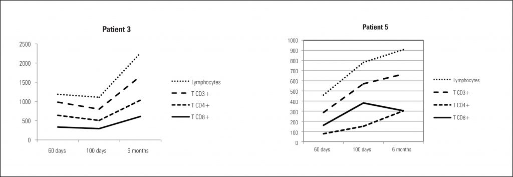 Seven pediatric patients with primary immunodeficiencies (severe combined immunodeficiency: n = 2; combined immunodeficiency: n = 1; chronic granulomatous disease: n = 1; hyper-IgM syndrome: n = 2; and IPEX syndrome: n = 1) who underwent eight hematopoietic stem cell transplants in a single center, from 2007 to 2010, were studied.