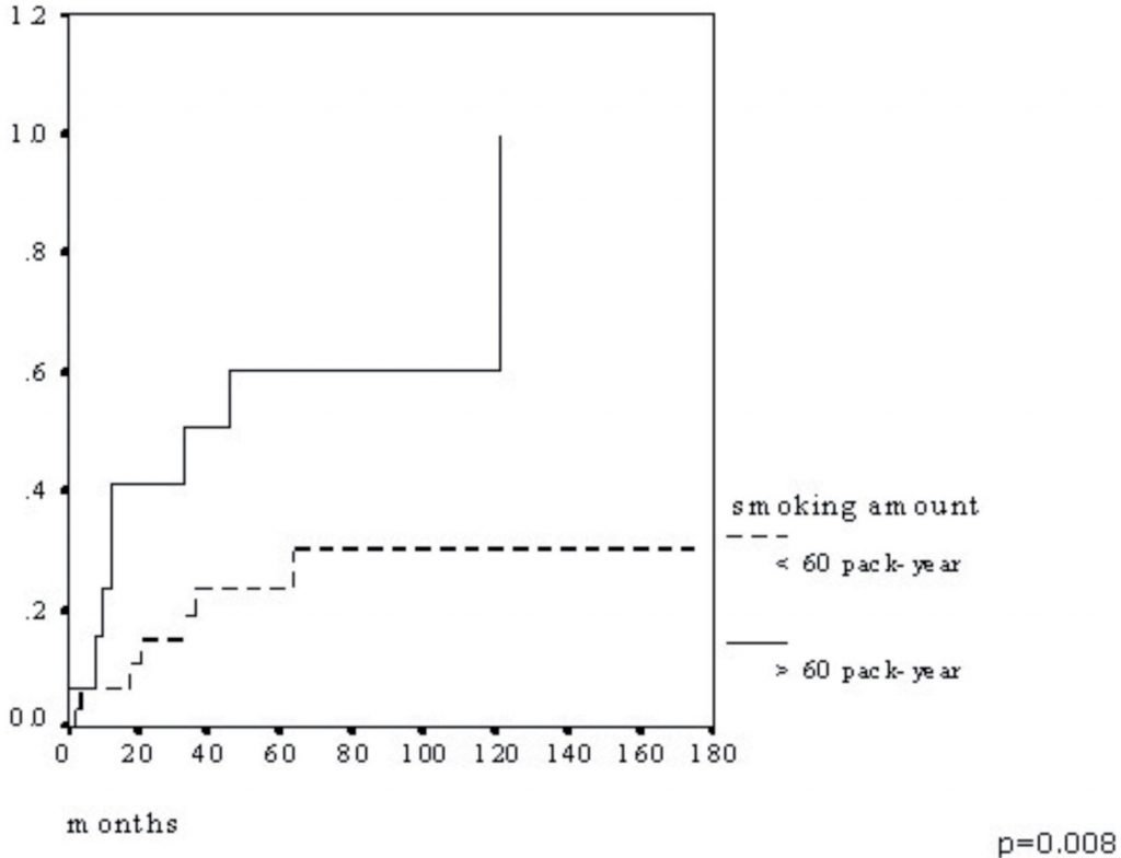 Smoking habit was significantly more common in males (p = 0.03). Cancer also occurred at an earlier age among smokers (70.8 versus 64.8 years, p = 0.030). Tobacco consumption was present in 62.7% of the patients with bladder cancer. There was a significant higher progression rate to muscle-invasive disease in patients that had more than 60 pack-years of exposure (52.9 versus 26.2%, p = 0.037). These patients had a mean progression time of 59.3 months, whereas patients who had smoked less than 60 pack-years progressed after a mean time of 131.8 months.