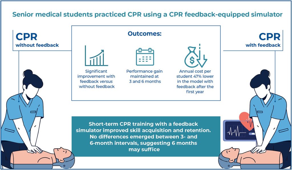 Short-term training with a cardiopulmonary resuscitation feedback-equipped simulator significantly improved cardiopulmonary resuscitation skill acquisition and retention. However, no differences were observed between the 3- and 6-month training intervals, suggesting that a 6-month interval may be sufficient for maintaining proficiency.