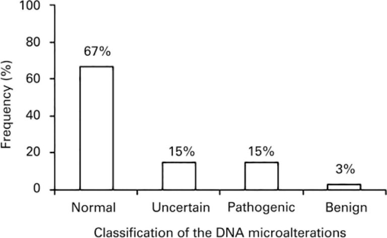 Twenty-six (66.7%) patients had normal results and 13 (33.3%) showed abnormal results – in that, 6 (15.4%) had pathogenic variants, 6 (15.4%) variants designated as uncertain and 1 (2.5%) non-pathogenic variants.