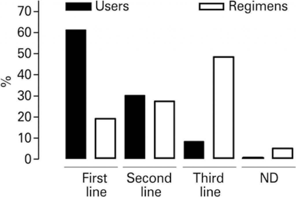 In Paraná, 35,127 individuals with HIV were treated with 253 different treatment regimens. Of the prescribed regimens, 19.1% were first-line, 27.4% second-line and 48.5% third-line. Among non-compliances, the most prevalent were absence of association of protease inhibitors and ritonavir (42.8%), low efficacy triple therapy (36.9%), double therapy (26.1%), monotherapy (20.3%), and triple therapy of nucleoside analog reverse transcriptase inhibitors (17.1%).