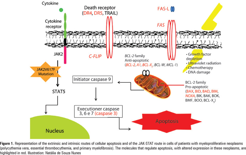 Philadelphia-chromosome negative chronic myeloproliferative neoplasms are clonal hematologic diseases characterized by hematopoietic progenitor independence from or hypersensitivity to cytokines. The cellular and molecular mechanisms involved in the pathophysiology of myeloproliferative neoplasms have not yet been fully clarified. Pathophysiologic findings relevant for myeloproliferative neoplasms are associated with genetic alterations, such as, somatic mutation in the gene that codifies JAK-2 (JAK V617F). Deregulation of the process of programmed cellular death, called apoptosis, seems to participate in the pathogenesis of these disorders. It is known that expression deregulation of pro- and anti-apoptotic genes promotes cell resistance to apoptosis, culminating with the accumulation of myeloid cells and establishing neoplasms. This review will focus on the alterations in apoptosis regulation in myeloproliferative neoplasms, and the importance of a better understanding of this mechanism for the development of new therapies for these diseases.
