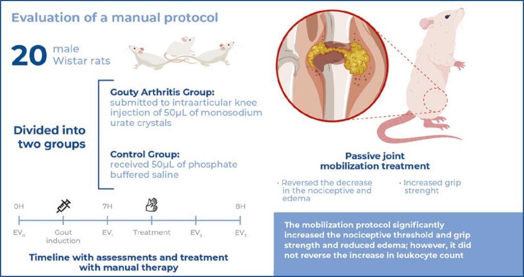 Twenty male Wistar rats, 12 weeks old, were divided into two groups (n=10 each): Gouty Arthritis and Control Groups, which were further subdivided into treated and untreated groups (n=5 each). The Gouty Arthritis Group received intraarticular knee injection of 50μL of monosodium urate crystals, while the Control Group received 50μL of phosphate buffered saline. The treatment involved a 9-minutes session of grade III joint mobilization (according to Maitland). Nociception, grip strength, and edema were evaluated before induction (EV0), 7 hours after assessment (EV1), immediately after treatment (EV2), and 1 hour after treatment (EV3). The animals were euthanized, and synovial fluid was collected to analyze leukocyte migration.