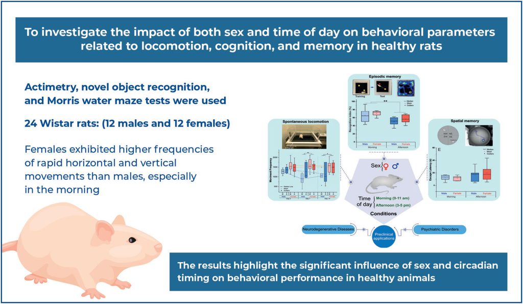 This study aimed to investigate the effects of sex and time of day on behavioral parameters in healthy rats, focusing on locomotion, cognition, and memory (both spatial and episodic).