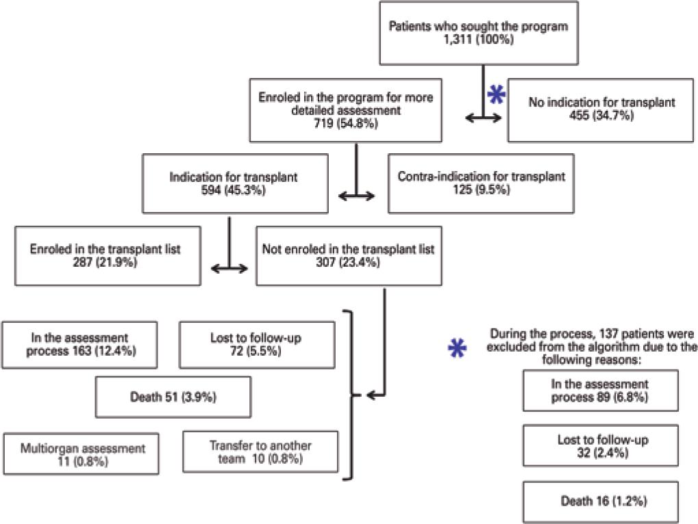 We analyzed 1,311 visits in the transplant outpatient clinic, most males (66.7%), white (65.1%), mean age of 53 (±12.5) years, from the Southeastern Region (91.2%), and from the State of São Paulo (80.8%). The indicators measured were efficiency of patient admission process (54.8%), efficiency of evaluation of transplant indication (39.9%), efficacy of treatment of patients seen in the program (21.8%), and waiting time to inclusion in the waiting list, median of 84 days (36-142).