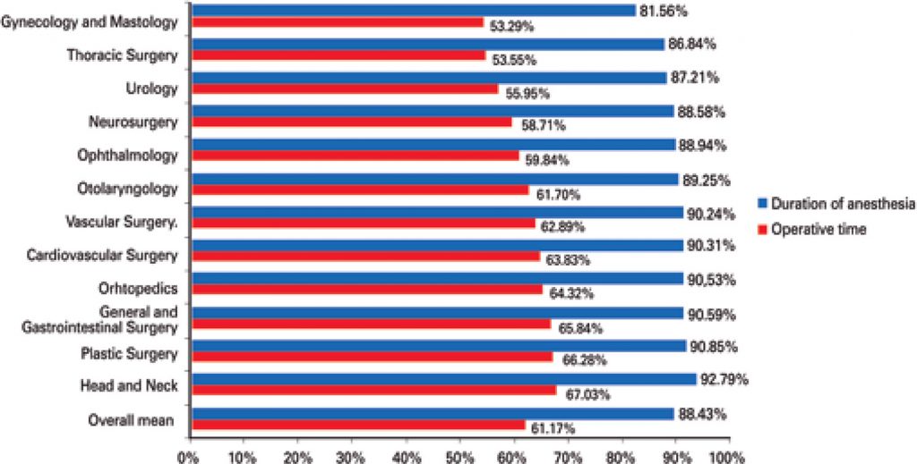 The study measured 8,337 operations of 12 surgical specialties performed within one year. The overall mean duration of anesthesia of all specialties was 178.12±110.46 minutes, and the 80th percentile was 252 minutes. The mean operative time was 130.45±97.23 minutes, and the 80th percentile was 195 minutes. The mean total time of the patient in the operating room was 197.30±113.71 minutes, and the 80th percentile was 285 minutes. Thus, the variation of the overall mean compared to the 80th percentile was 41% for anesthesia, 49% for surgeries and 44% for operating room time. In average, anesthesia took up 88% of the operating room period, and surgery, 61%.