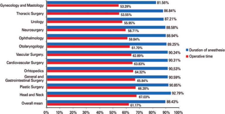 The study measured 8,337 operations of 12 surgical specialties performed within one year. The overall mean duration of anesthesia of all specialties was 178.12±110.46 minutes, and the 80th percentile was 252 minutes. The mean operative time was 130.45±97.23 minutes, and the 80th percentile was 195 minutes. The mean total time of the patient in the operating room was 197.30±113.71 minutes, and the 80th percentile was 285 minutes. Thus, the variation of the overall mean compared to the 80th percentile was 41% for anesthesia, 49% for surgeries and 44% for operating room time. In average, anesthesia took up 88% of the operating room period, and surgery, 61%.