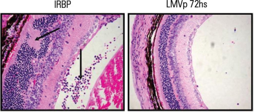 LMVp suppresses the clinical signs of actively induced EAU. B10.RIII mice were immunized with 100 µg of IRBP on day 0 and treated with 100 µg i.p. of LMVp 72 hours before immunization. Eyes were collected for histopathology 21 days after immunization. EAU scores were assigned on a scale from 0 to 4, according to the extent of inflammation and tissue damage.