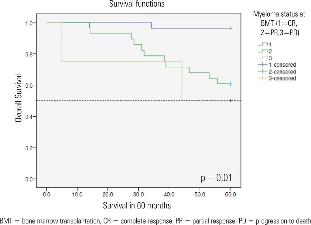 Seventy-three patients were evaluated with a median age of 55 years. Survival in 5 years was 75% (2.4 to 60 months). Statistical analysis demonstrated statistical significance for the applied grade of response prior to treatment with autologous bone marrow transplantation (p = 0.01). There was no statistical significance for clinical staging or time of diagnosis (before or after the year 2000).