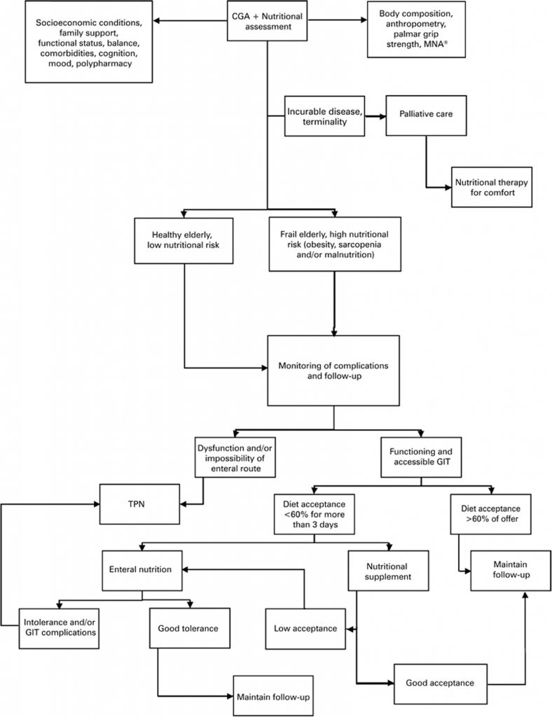 The Brazilian Nutritional Consensus in Hematopoietic Stem Cell Transplantation: Elderly was elaborated by nutritionists, nutrologists and hematologists physicians from 15 Brazilians reference centers in hematopoietic stem cell transplantation, in order to emphasize the importancy of nutritional status and the body composition during the treatment, as well as the main characteristics related to patient’s nutritional assessment. Establishing the consensus, we intended to improve and standardize the nutritional therapy during the hematopoietic stem cell transplantation. The Consensus was approved by the Brazilian Society of Bone Marrow Transplantation.