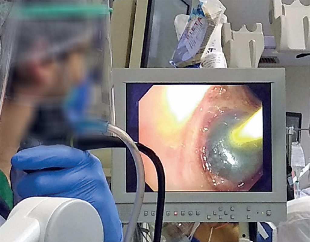 A total of 132 bronchoscopies were performed in 103 patients diagnosed with COVID-19. Mean age was 56.1±14.5 years, and distribution was similar in both sexes. More than one test was performed in 16 patients. The most frequent indications were diagnostic endoscopic evaluation and therapeutic procedures in 78.6% of cases (n=81) and material collection in 21.4% of cases (n=22). The most frequent endoscopic findings were presence of secretion or clots in 34% of cases, the presence of acute inflammatory changes in 22.3%, and tracheal wall laceration in 20.4%. In 27.2% of patients, no relevant bronchoscopic findings were observed. In three patients, bronchoscopy was indicated to assess hemoptysis, but there was only one case of active bleeding. Procedure-related complications were not observed in this group of patients.