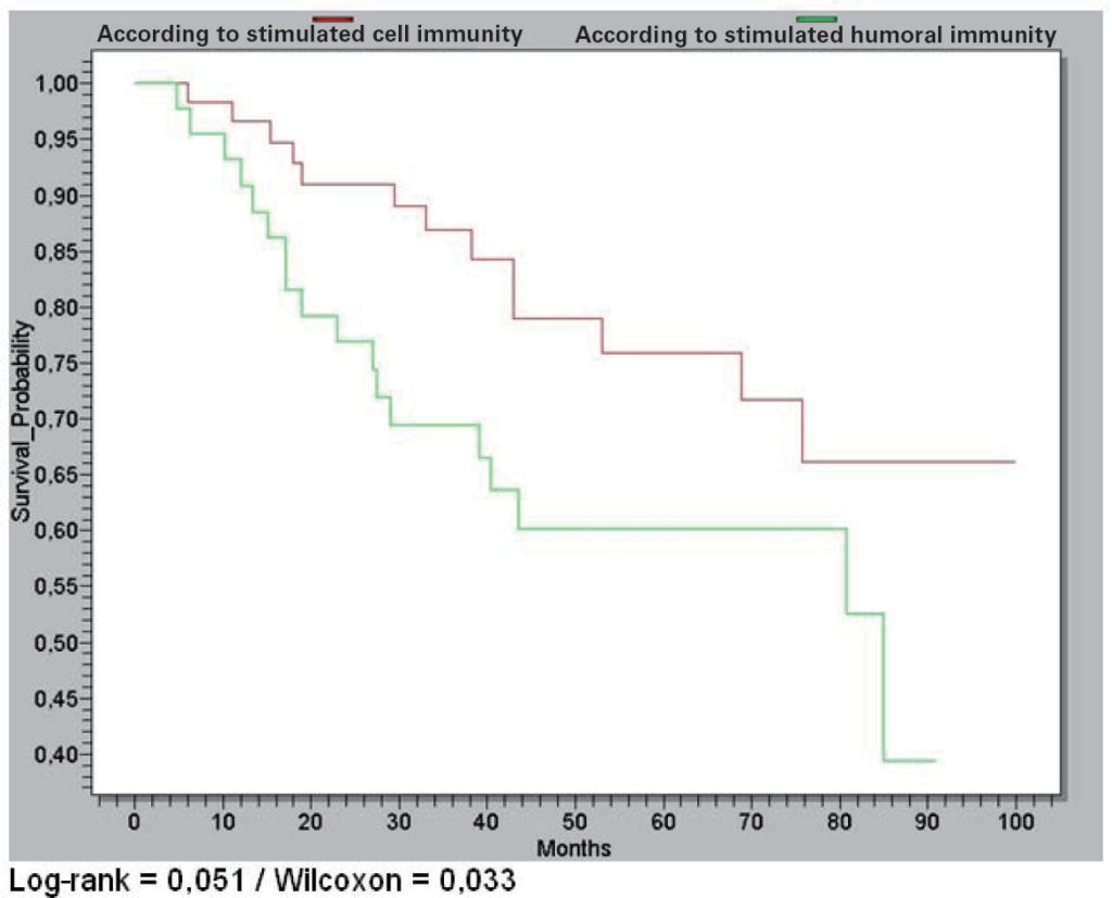 The total number of lymph nodes studied was 3,648, with an average of 34.7 lymph nodes/neck specimens. The most frequent lymph node reactivity patterns were sinusal histiocytosis (50 cases), paracortical hyperplasia (35 cases), and follicular hyperplasia (20 cases). There was no statistical association of these individual patterns with recurrence rate (p = 0.98) or mortality (p = 0.49). However, there was a statistically significant association between paracortical hyperplasia pattern (related to cellular lymph node immunity) and improved five-year survival (76 versus 60%; log-rank = 0.05).