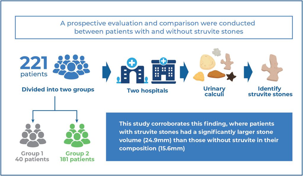 Stone fragments obtained using endourological procedures were subjected to crystallographic analysis. A prospective evaluation and comparison were conducted between patients with and without struvite stones. Sex, age, comorbidities, Hounsfield Unit Coefficient, stone size, urine culture, and urinary pH were analyzed.