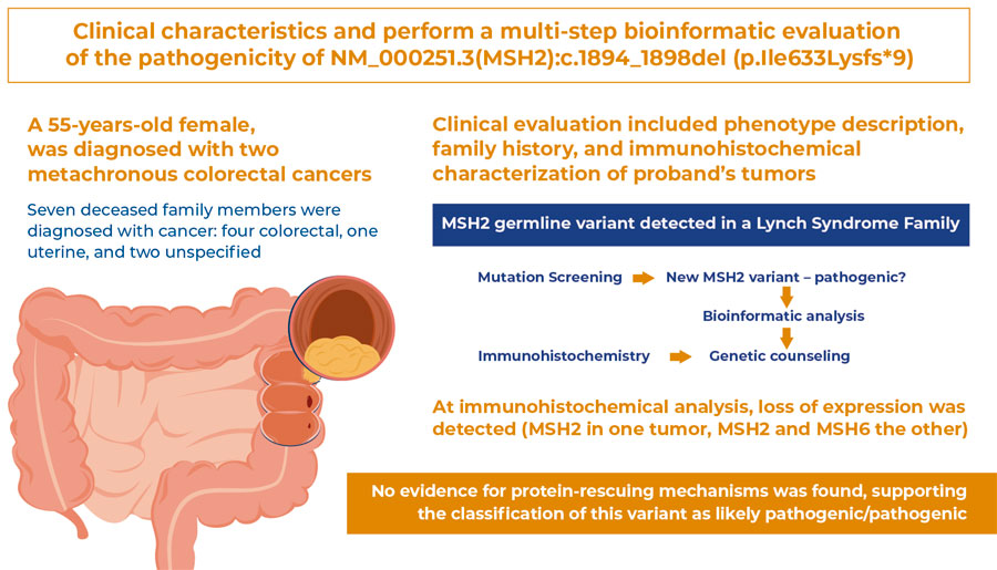 To describe the clinical characteristics and perform a multi-step bioinformatics evaluation of the pathogenicity of NM_000251.3(MSH2):c.1894_1898del (p.Ile633Lysfs*9), an MSH2 germline variant detected in a family with Lynch syndrome.