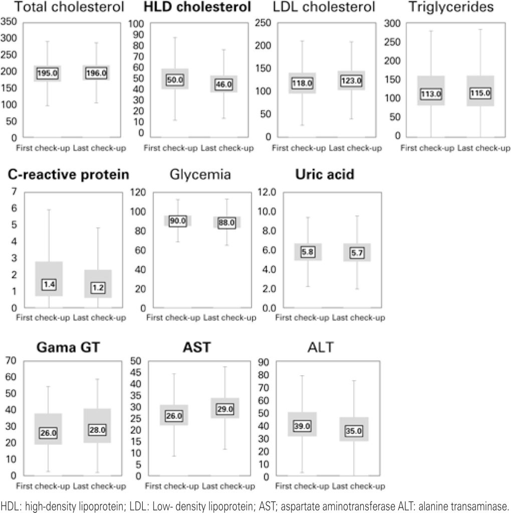 A total of 3,150 patients was included in the final analysis. A worsening was observed in all risk factors, excepting in smoking habit, incidence of myocardial infarction or stroke and in the number of individuals classified as medium or high risk for cardiovascular events. In addition, a decrease in stress level and alcohol consumption was also seen.