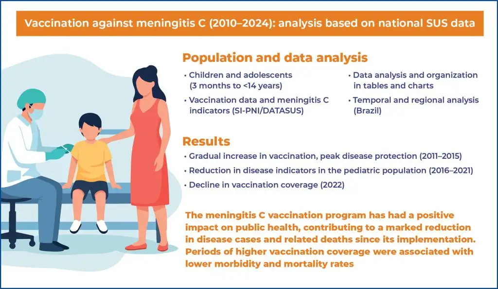 Following the introduction of the meningitis C vaccine in the National Immunization Program in 2010, the incidence of the disease in Brazil decreased significantly. From 2010 to 2015, the number of confirmed cases decreased by approximately 81%, reaching the lowest recorded rate in 2021 (0.02 per 100,000 inhabitants), representing a 98% reduction. However, an increase in the incidence was observed in 2022 (0.05 per 100,000 inhabitants). Although vaccination coverage exceeded 95% in 2011, it has declined in subsequent years.