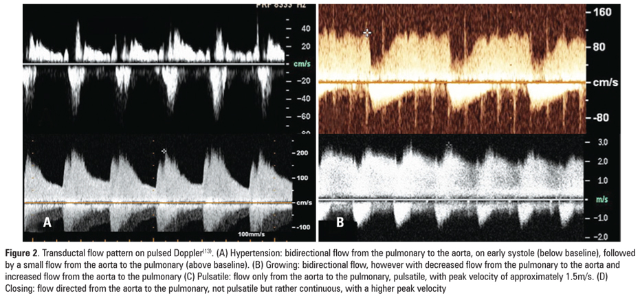 OBJECTIVE: To identify clinical and echocardiographic parameters associated with the evolution of the ductus arteriosus in neonates with birth weight lower than 1,500g. METHODS: Retrospective study of 119 neonates in which clinical parameters (Prenatal: maternal age, risk of infection and chorioamnionitis, use of corticosteroid, mode of delivery and gestational age. Perinatal: weight, Apgar score, gender and birth weight/gestational age classification; Postnatal: use of surfactant, sepsis, fluid intake, heart murmur, heart rate, precordial movement and pulses, use of diuretics, oxygenation index, desaturation/apnea, ventilatory support, food intolerance, chest radiography, renal function, hemodynamic instability, and metabolic changes) and echocardiographic parameters (ductus arteriosus diameter, ductus arteriosus/weight ratio, left atrium/ aorta ratio, left ventricular diastolic diameter, and transductal flow direction, pattern and velocity) were analyzed. The clinical and echocardiographic parameters analyzed were considered statistically significant when p<0.05. RESULTS: In the 119 neonates, the incidence of patent ductus arteriosus was 61.3%; 56 received treatment (46 pharmacological and 10 surgical treatment), 11 had spontaneous closure, 4 died, and 2 were discharged with patent ductus arteriosus. A higher incidence of chorioamnionitis, use of surfactant, lower weight and gestational age, sepsis, heart murmur, ventilatory support and worse oxygenation indices were observed in the neonates receiving treatment. The group with spontaneous closure had a smaller ductus arteriosus diameter, lower ductus arteriosus/weight ratio, and higher transductal flow velocity. CONCLUSION: Based on clinical and echocardiographic parameters, the neonates with spontaneous closure of the ductus arteriosus could be differentiated from those who required treatment.