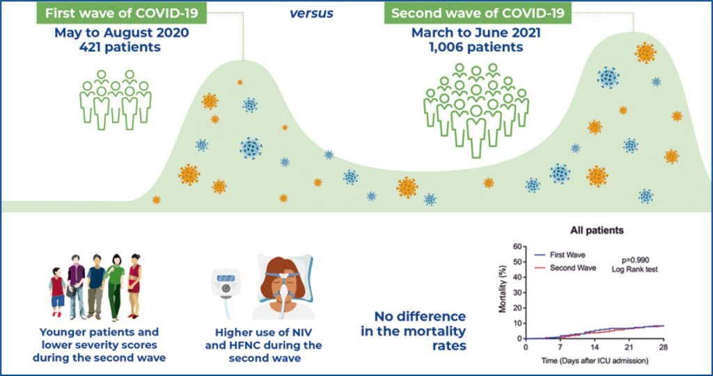 In total, 1,427 patients with COVID-19 were admitted to the intensive care unit during the first (421 patients) and second (1,006 patients) waves. Compared with the first wave group [median (IQR)], the second wave group was younger [57 (46-70) versus 67 (52-80) years; p<0.001], had a lower SAPS 3 Score [45 (42-52) versus 49 (43-57); p<0.001], lower SOFA Score on intensive care unit admission [3 (1-6) versus 4 (2-6); p=0.018], lower Charlson Comorbidity Index [0 (0-1) versus 1 (0-2); p<0.001], and were less frequently frail (10.4% versus 18.1%; p<0.001). The second wave group used more noninvasive ventilation (81.3% versus 53.4%; p<0.001) and high-flow nasal cannula (63.2% versus 23.0%; p<0.001) during their intensive care unit stay. The intensive care unit (11.3% versus 10.5%; p=0.696) and in-hospital mortality (12.3% versus 12.1%; p=0.998) rates did not differ between both waves.
