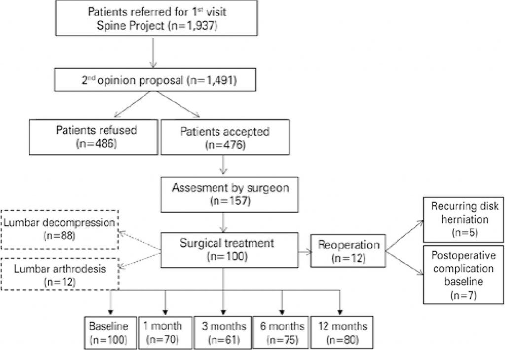A prospective, observational cohort study with 100 patients enrolled in the Second Opinion Program who underwent lumbar spine surgery. Questionnaires addressing pain intensity, level of disability, quality of life, anxiety and depression were applied prior to and within 1, 3, 6 and 12 months of surgery. Descriptive and comparative statistical analyses were performed. The following clinical outcomes were analyzed: pain intensity, level of disability, quality of life, anxiety, and depression.
