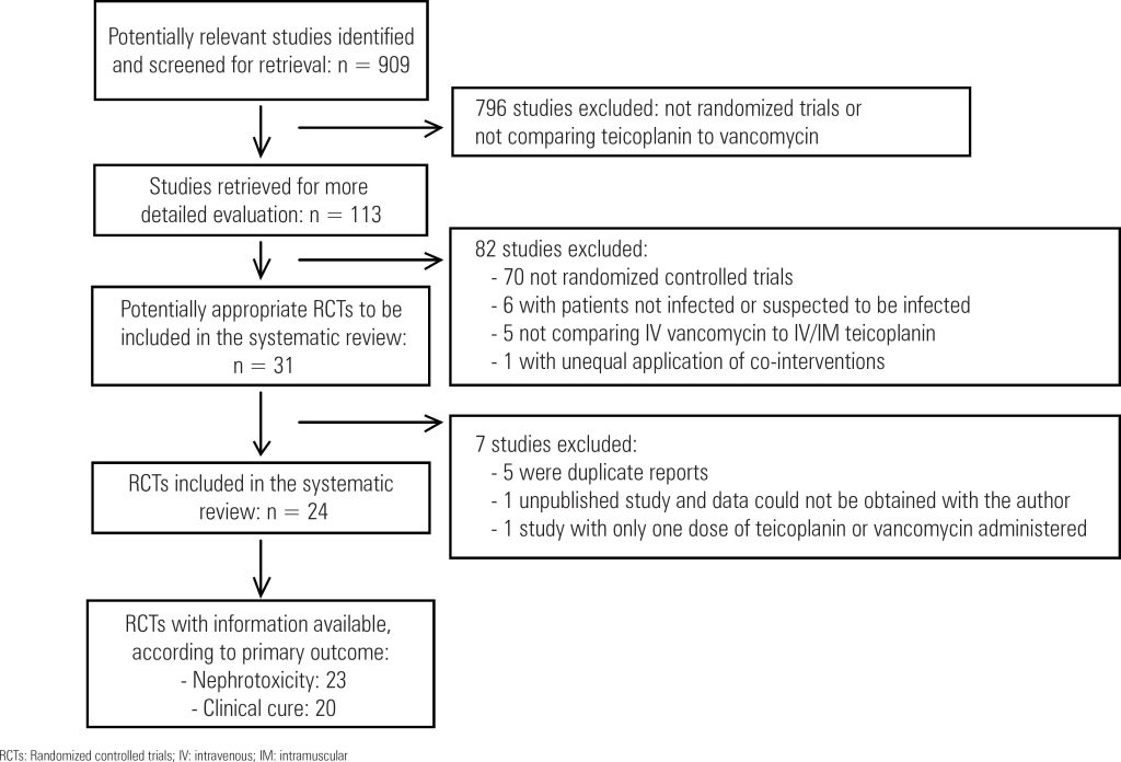 A total of 24 studies (2,610 patients) were included. The drugs had similar rates of clinical cure (RR: 1.03; 95%CI: 0.98-1.08), microbiological cure (RR: 0.98; 95%CI: 0.93-1.03) and mortality (RR: 1.02; 95%CI: 0.79-1.30). Teicoplanin had lower rates of skin rash (RR: 0.57; 95%CI: 0.35-0.92), red man syndrome (RR: 0.21; 95%CI: 0.08-0.59) and total adverse events (RR: 0.73; 95%CI: 0.53-1.00). Teicoplanin reduced the risk of nephrotoxicity (RR: 0.66; 95%CI: 0.48-0.90). This effect was consistent for patients receiving aminoglycosides (RR: 0.51; 95%CI: 0.30-0.88) or having vancomycin doses corrected by serum levels (RR: 0.22; 95%CI: 0.10-0.52). There were no cases of acute kidney injury needing dialysis.