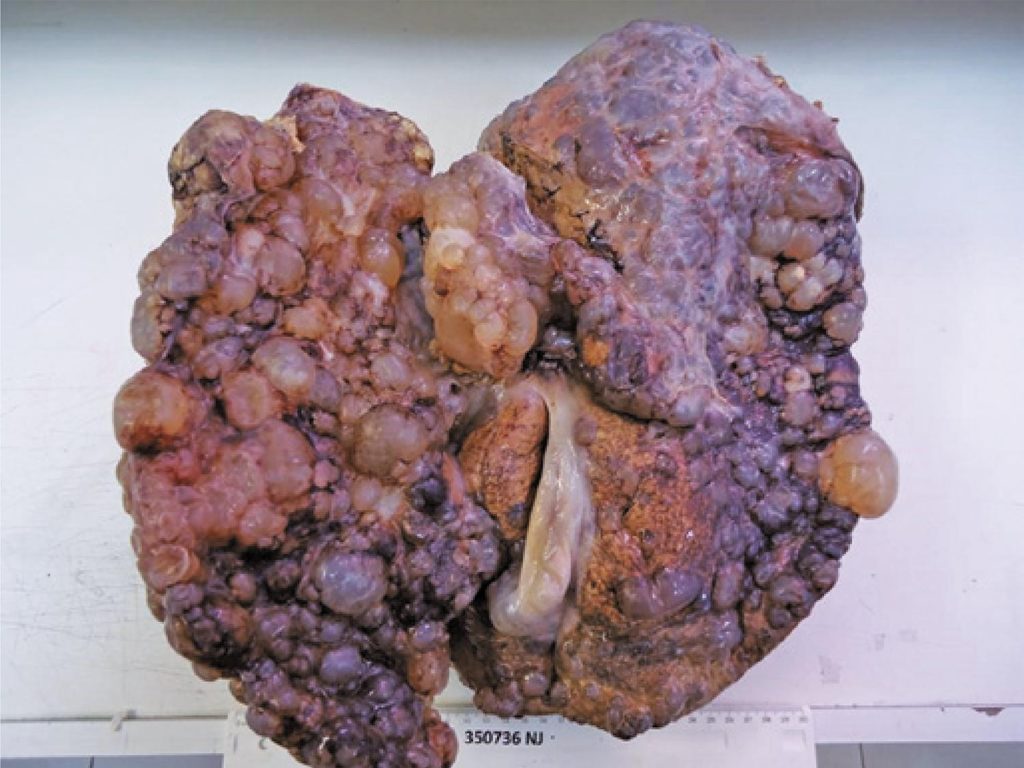 Polycystic liver disease, a hereditary pathology, usually manifests as autosomal dominant polycystic kidney disease. The many cysts in the liver cause massive hepatomegaly, majorly affecting the patient’s quality of life. In cases of refractory symptoms, liver transplantation is the only treatment choice. A 43-year-old woman was followed up as a hepatology outpatient in August 2020, with a progressive increase in abdominal volume, lower limb edema, and cachexia. The patient was diagnosed with polycystic renal and liver disease with massive hepatomegaly in March 2021, a combined kidney-liver transplant. Liver size represented 13% of the patient’s corporal composition, weighing 8.6kg. The patient was discharged on the 7th postoperative day with no complications. Only 10-20% of patients with polycystic liver disease have clinical manifestations, most of which result from hepatomegaly. An increase in liver volume deteriorates liver function until the condition becomes end-stage liver disease, as kidney function is already compromised; liver-kidney transplantation remains the only treatment choice. The case described drew significant attention to the massive hepatomegaly presented in the patient, with the liver representing over 10% of the patient’s body weight, approximately five to six times larger than a normal-sized liver.