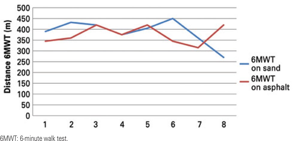 Twenty-nine patients performed the 6-minute walk test at a pulmonary rehabilitation clinic in Santo André (above sea level), in São Paulo State, and at the Enseada Beach, in Guarujá (at sea level), also in São Paulo State. Of these 29 patients, 8 did the test both on hard sand and on asphalt to analyze if there were differences in performance during the tests. Data such as heart rate, oxygen saturation, test distance, and Borg scale were compared.